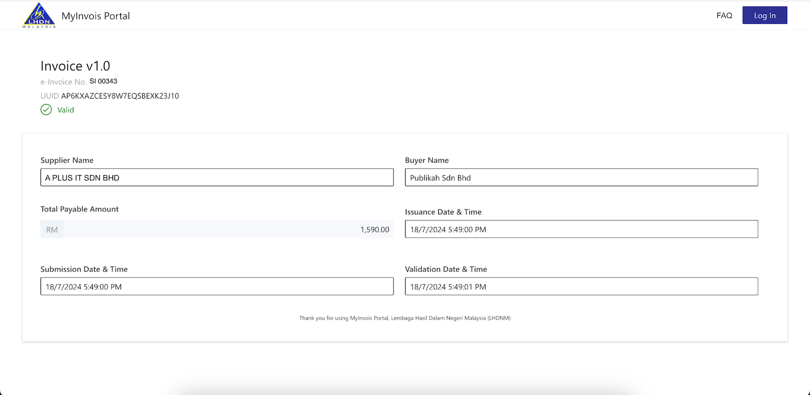 In 30 seconds (max.), after the e-invoice is submitted successfully, the status of the e-invoice will change to ‘Valid’ to indicate that the e-invoice has been validated by LHDN successfully as shown in the image below.
