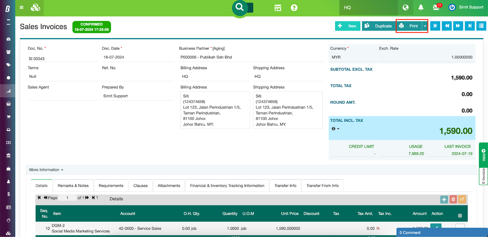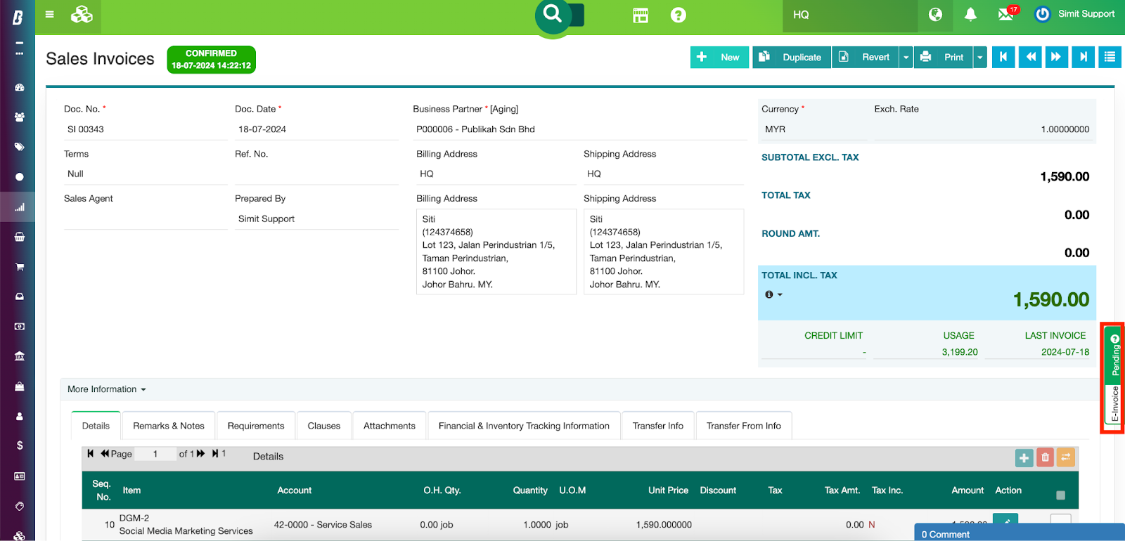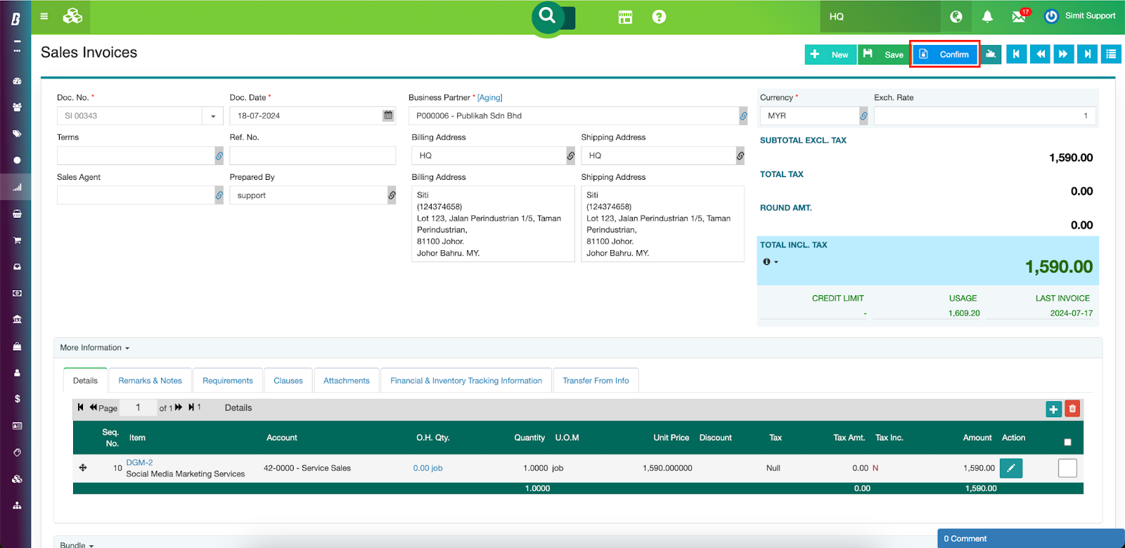 Step 1. Create the transaction in SimBiz® as you normally would before the e-invoice integration.