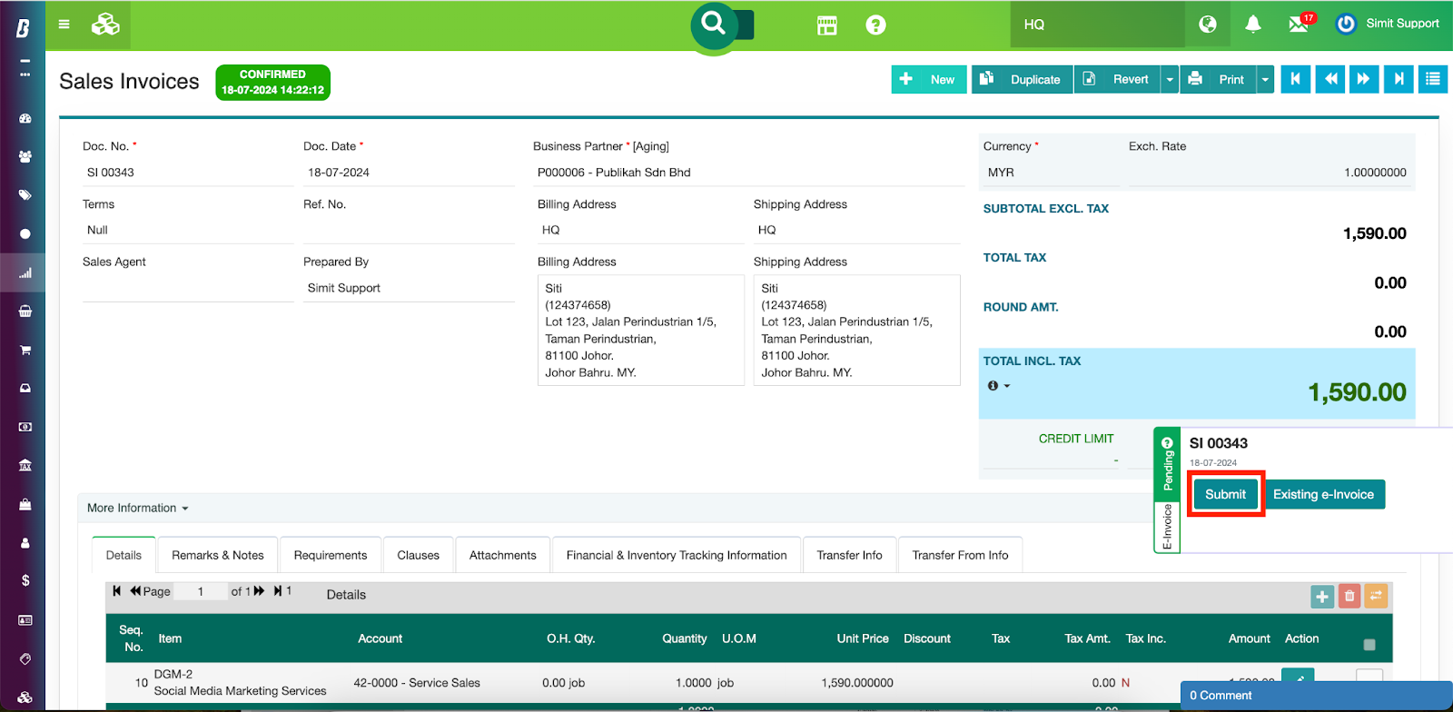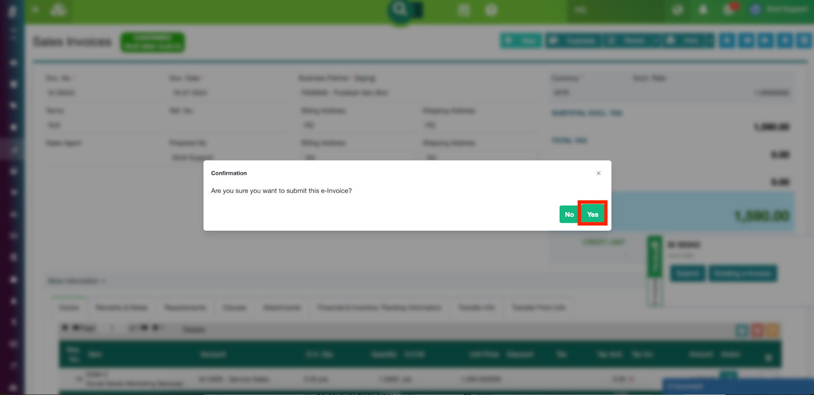 Step 3. Click the Submit button on the e-invoice sidebar to initiate the submission process.