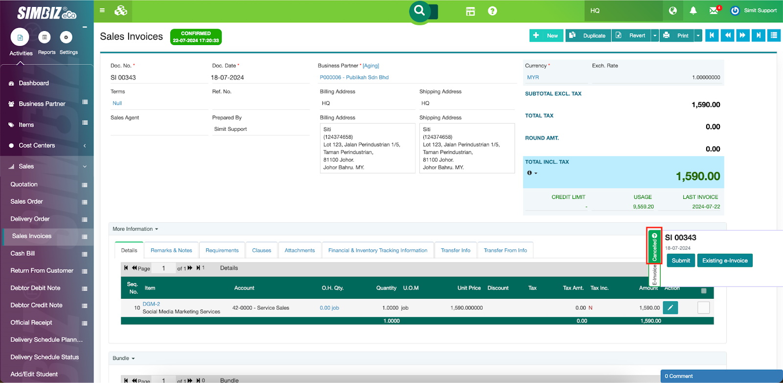 If the cancellation request is accepted, the status of the e-invoice will be changed to ‘Cancelled’.