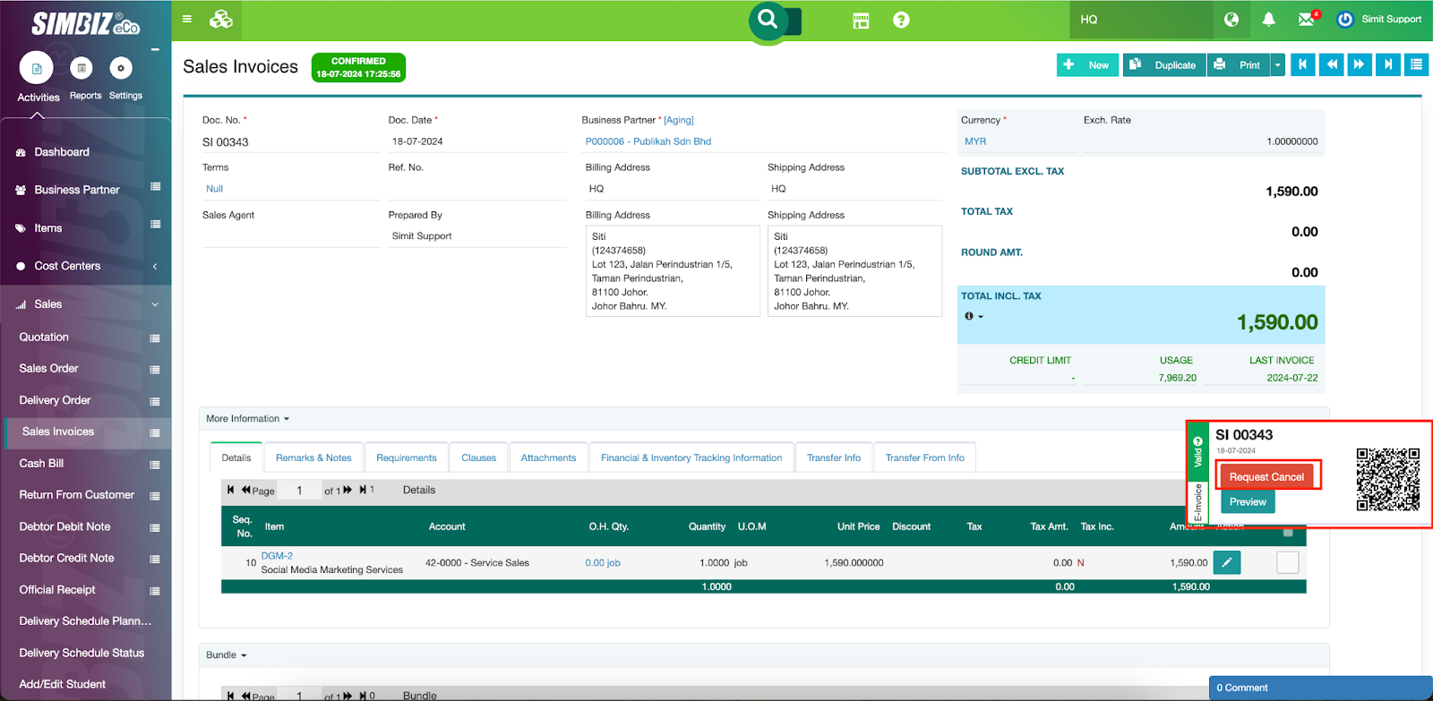 In any cases where users need to cancel the validated e-invoice*, they can do so by pressing the Request Cancel button as shown in the image below: