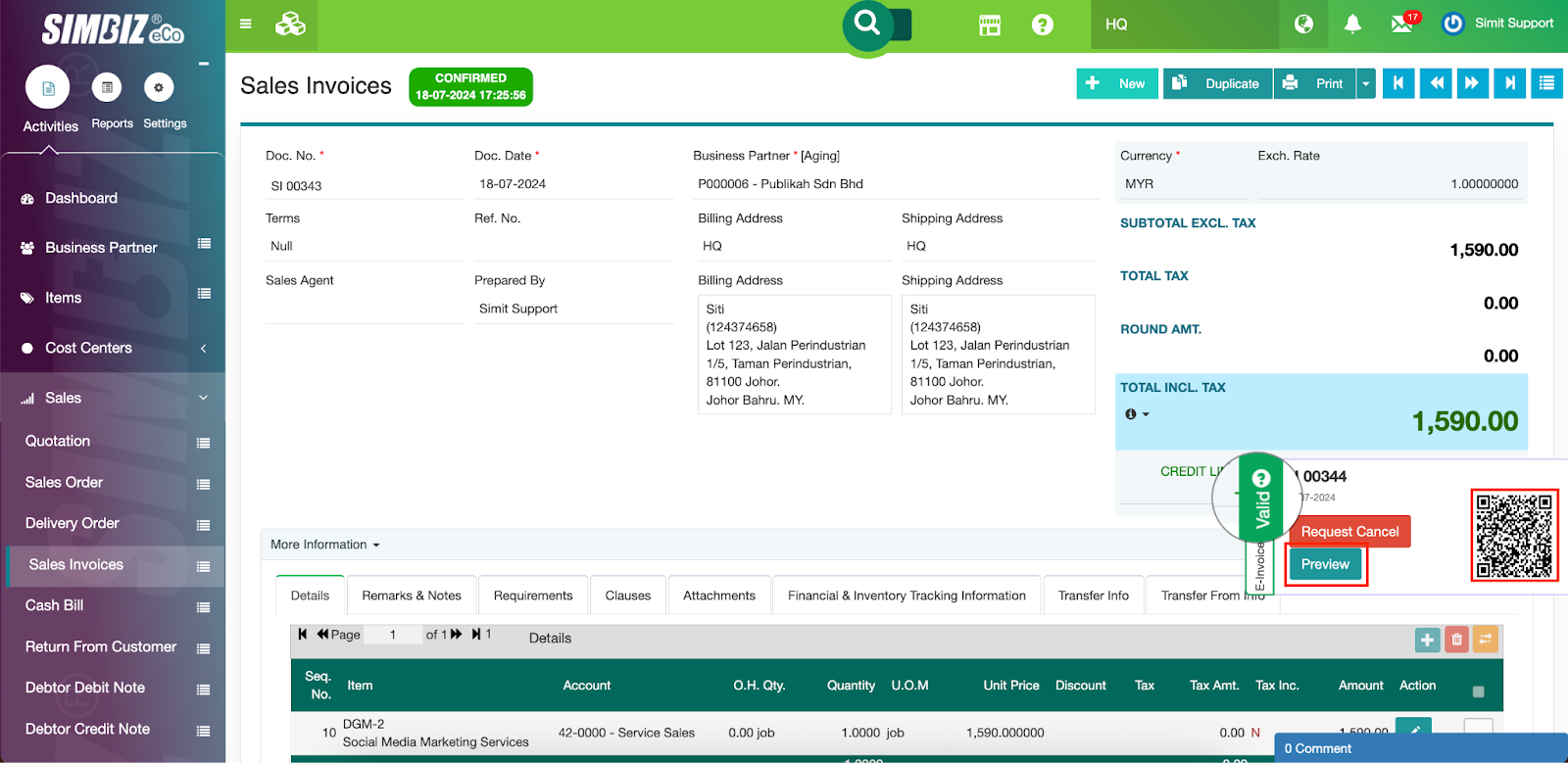 A QR code is now available on the document. If users scan it, they will be directed to the MyInvois portal, which shows the details of the e-invoice. The same happens when the Preview button is clicked.