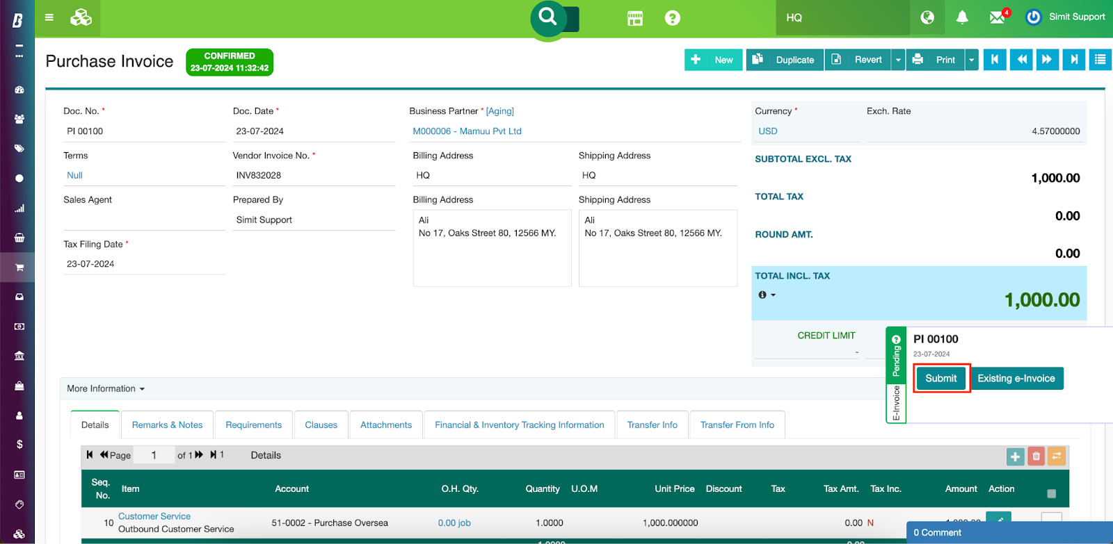 Steps 1 : Like the individual e-invoice submission process here, create the self-bill invoice via the Purchase Invoice in the Purchase module. Confirm the transaction document and submit it through the e-invoice sidebar.